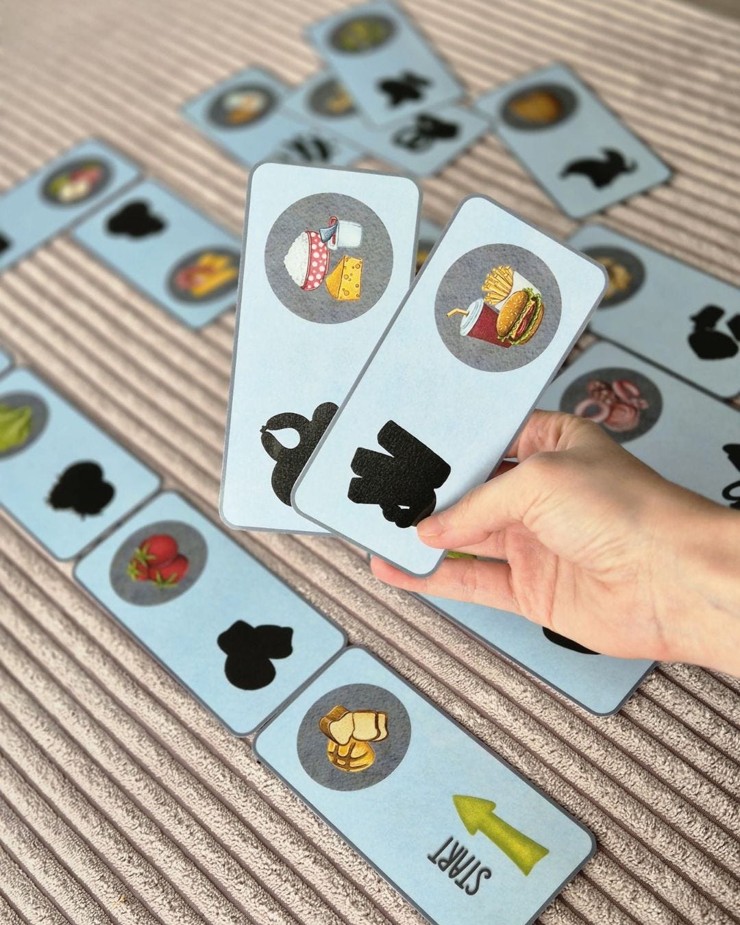 Hier darf ganz genau hingeschaut werden: Welcher Schatten passt zu welchem Lebensmittel. Nebenbei wird der Wortschatz und die Satzbildung im Bereich der Lebensmittel gestärkt